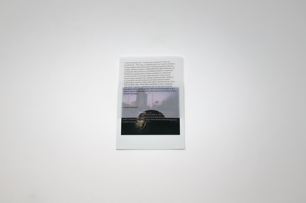 Paula was interested in the poignance that comes from looking back at those moments before our lives were changed by the pandemic, from an artistic and international perspective. Those involved include performance artists, writers, visual artists and one doctor, based in London, Berlin, Stockholm, Amsterdam, Glasgow, Bristol,and Birmingham.