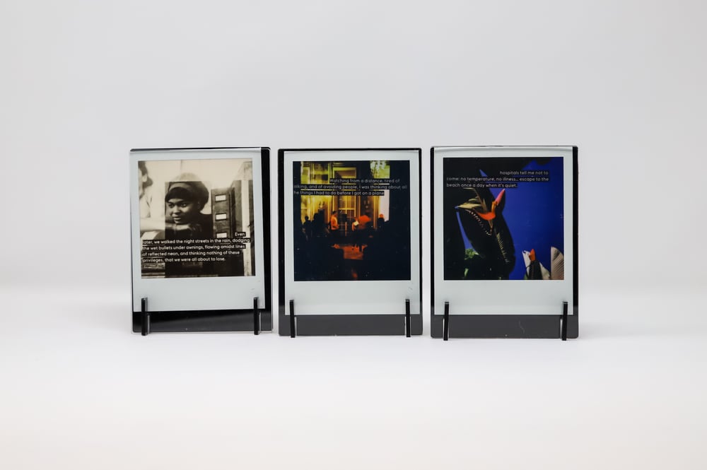 Box of three poloroids in vellum sleeves, packaged in a5 gift box with card including information on all artists involved (please note acrylic frames not included)